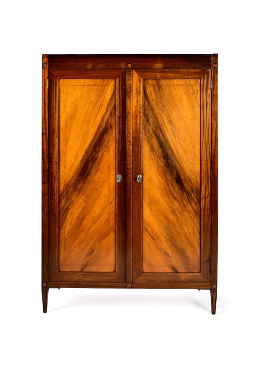 The door panels are book-matched to create a symmetrical and mirrored figuring. This creates a dramatic flame pattern rising from the lower outer corners towards the centre, another indication of a very skilled craftsman.
