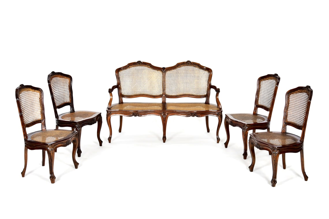 comprising: a two-seater settee and four matching chairs; each with shield-shaped caned back with central carved cresting, serpentine-fronted caned seat with foliate-carved apron raised on cabriole legs, terminating in carved hoof feet