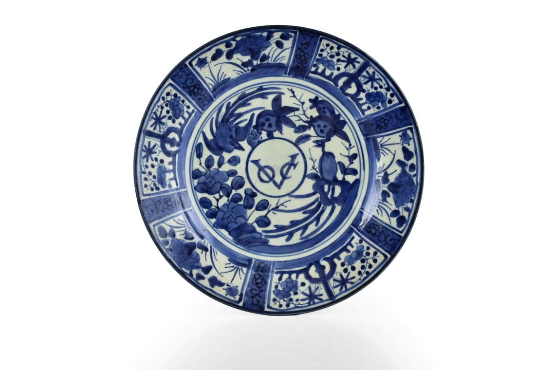 Decorated in underglaze blue with the central roundel containing the initials of the Dutch East India Company, VOC [Vereenigde Oostindische Compagnie], surrounded by two ho-o birds amongst pomegranate and camellia, the six radiating border panels at the rim enclosing alternatively bamboo and peony divided by narrow bands of stylised foliage.