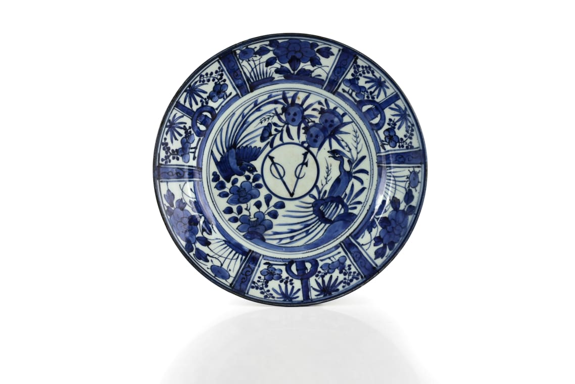 Decorated in underglaze blue with the central roundel containing the initials of the Dutch East India Company, VOC [Vereenigde Oostindische Compagnie], surrounded by two ho-o birds amongst pomegranate and camellia, the six radiating border panels at the rim enclosing alternatively bamboo and peony divided by narrow bands of stylised foliage.
