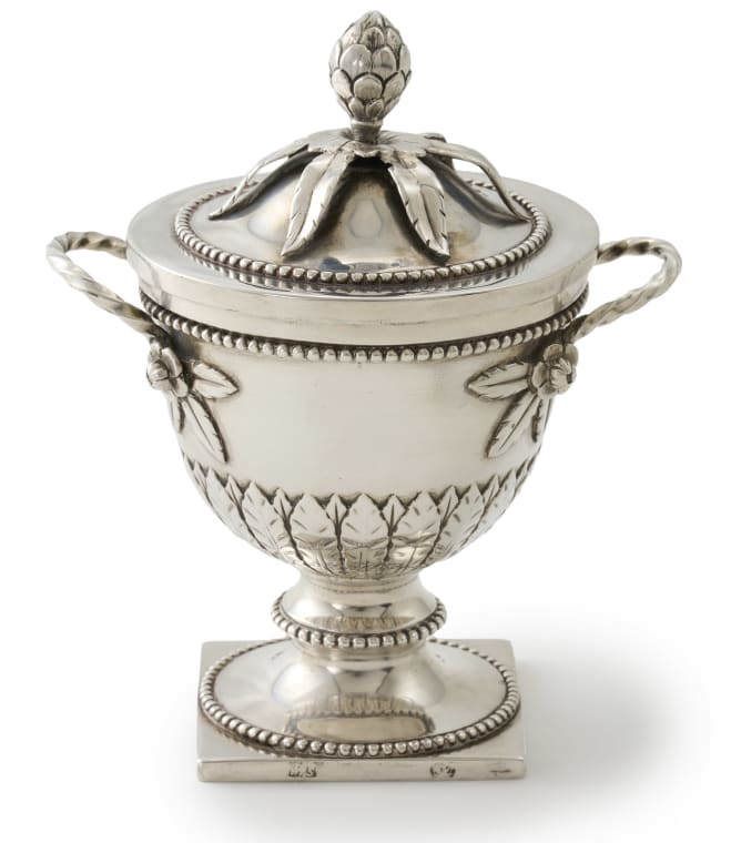 urn-shaped with beaded borders, the sides applied with a pair of rope-twist handles with foliate terminals, the semi-domed cover fitted with later hinge, surmounted by a bud and leaf finial repaired, on a spreading circular foot and square base, 360g
