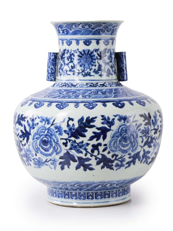 Painted with a continuous frieze of scrolling foliage and peony blooms above stylised wave bands and beneath a border of stippled ruyi (ju-i) heads. The neck carries a matching decorative band and is fitted with two cylindrical lug handles. The peony is a traditional symbol of wealth and honour in Chinese decorative arts.