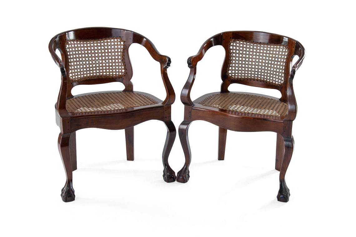 The ball-and-claw feet on these tub chairs would point to later reproductions showing English design influence. Earlier eighteenth century examples would have had slipper or block feet.