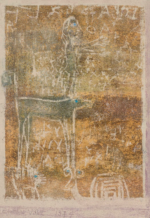 "By drawing into a surface of oil and sand, Villet echoes the cryptic calligraphy of rock artists, creating subtle, almost secretive inscriptions and intriguing surface elements."1