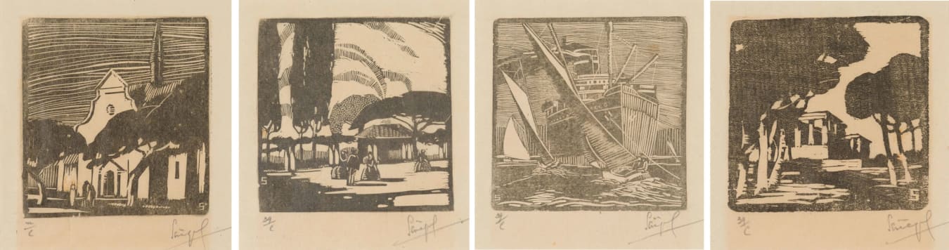 Cape Dutch Buildings with Figures; Ship at the Docks, An Old Fashioned Garden; Rhodes Memorial, four