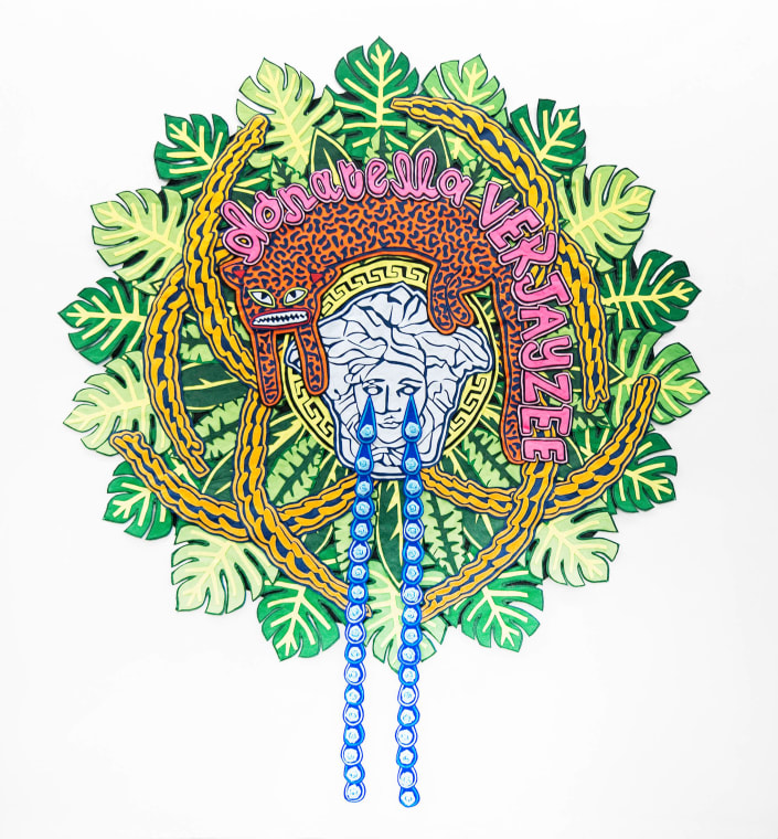 The present lot appeared on Jody Paulsen's debut solo exhibition, Pushing Thirty, a vivid showcase of his maximalist approach to composition that included 21 of his signature felt collages. A method perfected at the Michaelis School of Fine Art, University of Cape Town, Paulsen's brash ensemble pieces intermix references from pop culture, fashion, and cartoons, and often include additional text slogans demonstrating his media literacy and/or discussing his mixed-race queer identity. Paulsen credits artists Cameron Platter and Julia Rosa Clark for inspiring him to pursue an installation-based approach to displaying his work. Paulsen's collages invite comparisons with Jeremy Deller's processional banners and Tracey Emin's quilts, although, attitudinally at least, his work is closer to Andy Warhol in its love affair with consumer culture. This lot references the logo of the Italian luxury fashion company Versace, a stylised depiction of the head of Medusa. The exaggerated tears recall Brett Murray's wall-hung sculptures of baroque figures weeping from his exhibition Crocodile Tears (2007). Paulsen's interest in fashion is pronounced: he collaborates with designer Adriaan Kuiters on a fashion range, which has been lauded by Vogue Italia, among others.