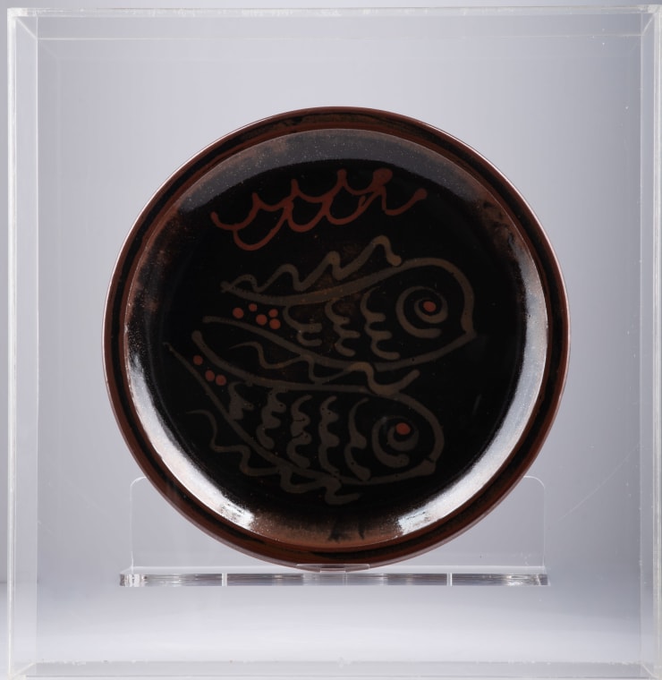 Platter is encased in a perspex box, adhered to the back with adhesive.