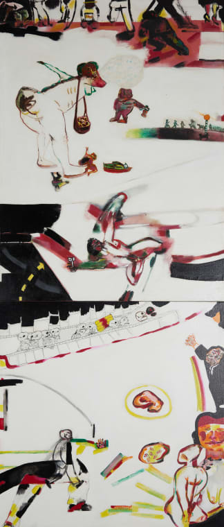 The work is populated by figures defined by disfigurement, distortion and the grotesque, reflecting a state of visceral panic and chaos. Hodgins employs a dramatic palette of reds, yellows, and whites—colours characteristic of his output during this turbulent decade.