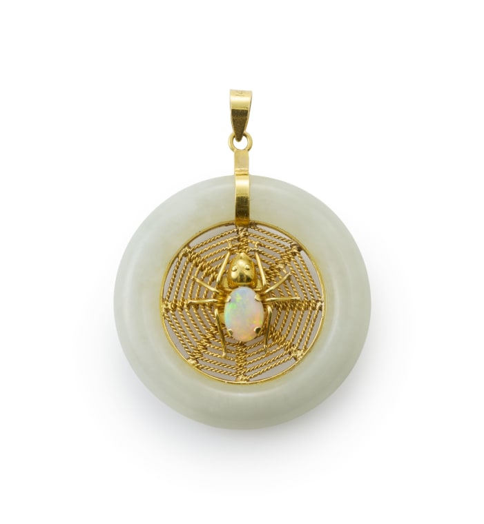 centered in the spider's abdomen a claw-set oval cabochon-cut opal weighing approximately 0.50 ct, on a granulated spider's web, surrounded by a carved ring of jadeite, connected to a simple bail, 18k yellow gold, length approximately 4cm, total weight 11.20 grams