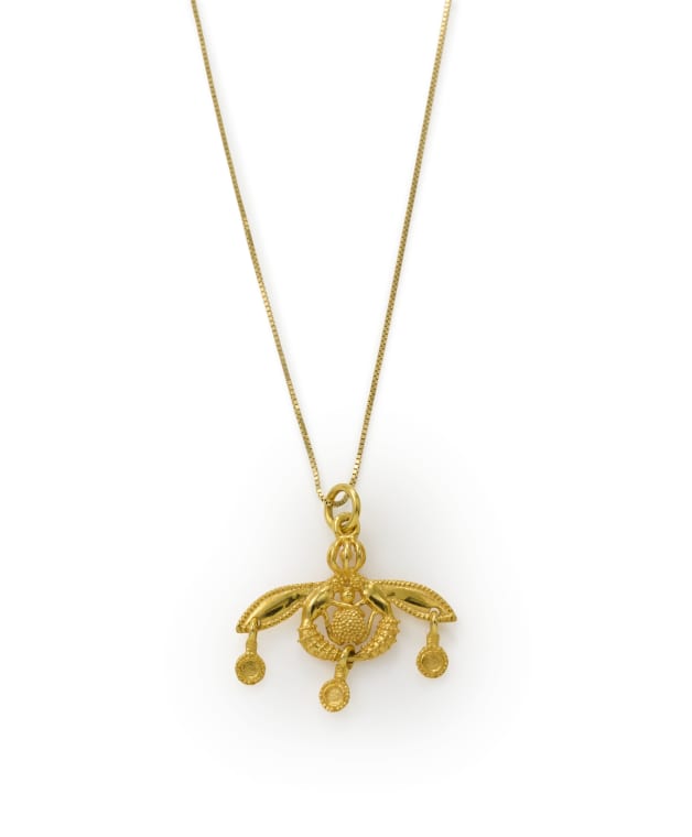The Malia Bee Pendant is one of the most well known pieces of Minoan jewellery, discovered on the island of Crete. The motif dates back to roughly 1800-1700 BC, during the Minoan Civilization.