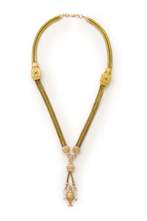an urn pendant with scroll-like handles, suspended below three wheat chains, connected to embossed terminals detailed with two tube-set round-cut rubies, dog clip clasp, 18k yellow gold chain and 12k rose gold urn and terminals, length approximately 16 cm, total weight 52.40 grams