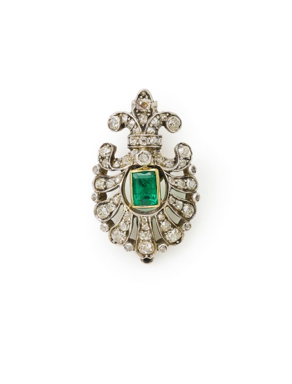 centered a bezel-set emerald-cut emerald weighing approximately 0.60 ct, in the fleur-de-lis motif 54 pavé-set old mine-cut diamonds weighing approximately 0.89 ct, on hidden bail, 9k two-tone gold, length approximately 2.5cm, total weight 4.20 grams