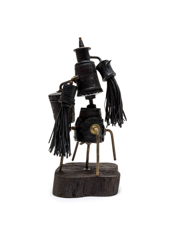 found rubber and metal tubing, on a wooden base