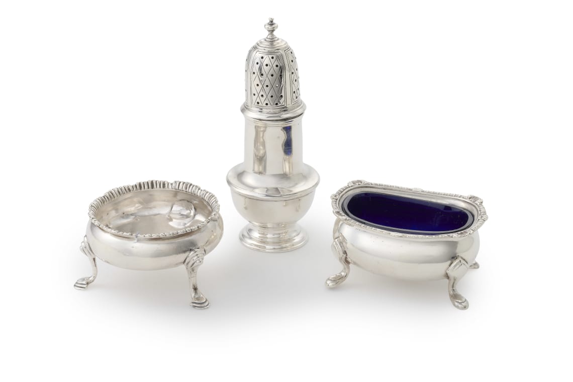 circular, with a gadrooned border, centre with a crest, on four hoof feet; a George V silver sugar caster, maker's mark worn, London, 1931, baluster, moulded with a girdle, the detachable cover with spire finial, raised on a circular foot; and an George VI silver salt, Walker & Hall, London, 1938, rectangular, with shell and gadrooned border, raised on four hoof feet, blue glass liner, 195g all in