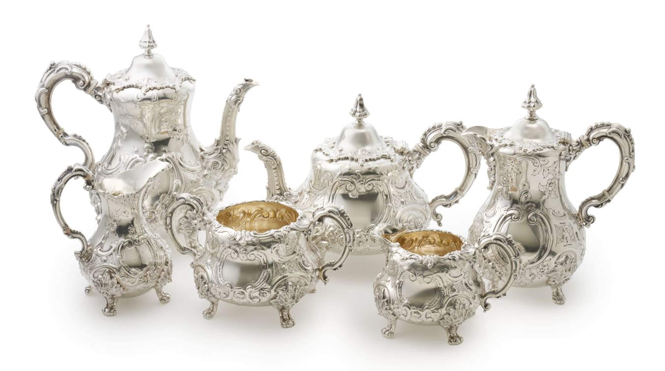 comprising: a coffee-pot, a teapot a hot water jug, a two-handled sugar bowl, a cream jug and a milk jug, all embossed with scrolling foliage, flowers and scrollwork, each side with cartouches, one vacant, one with engraved monogram, leaf-capped handles with ivory fillets, leaf-capped swan-neck spouts, on four feet, all in 4085g