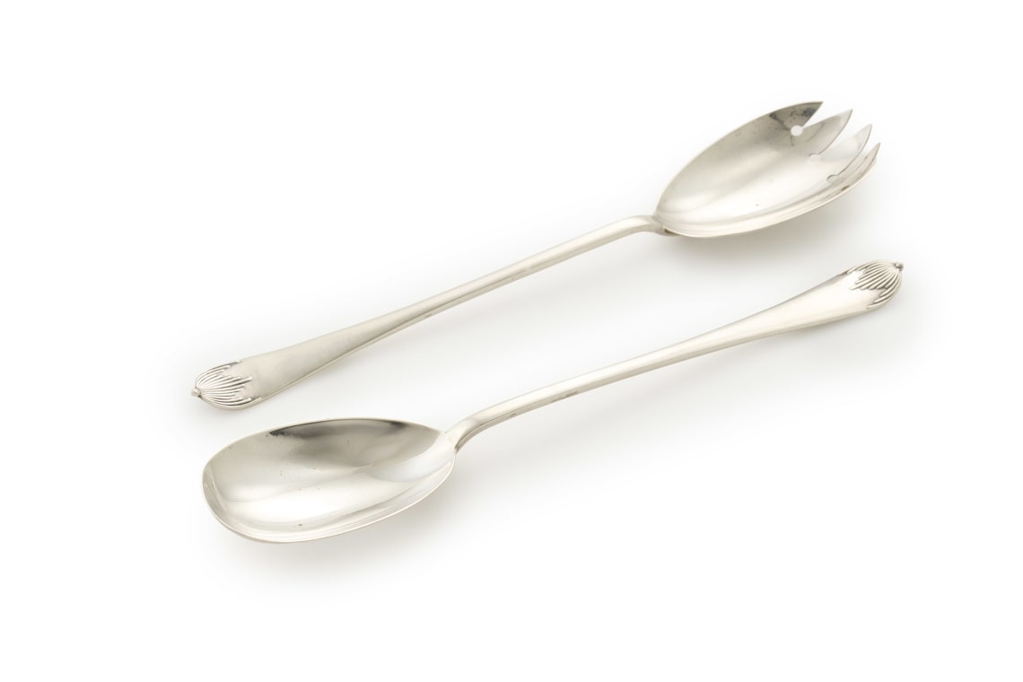 A pair of George V silver serving spoons, Walker and Hall, Sheffield, 1914