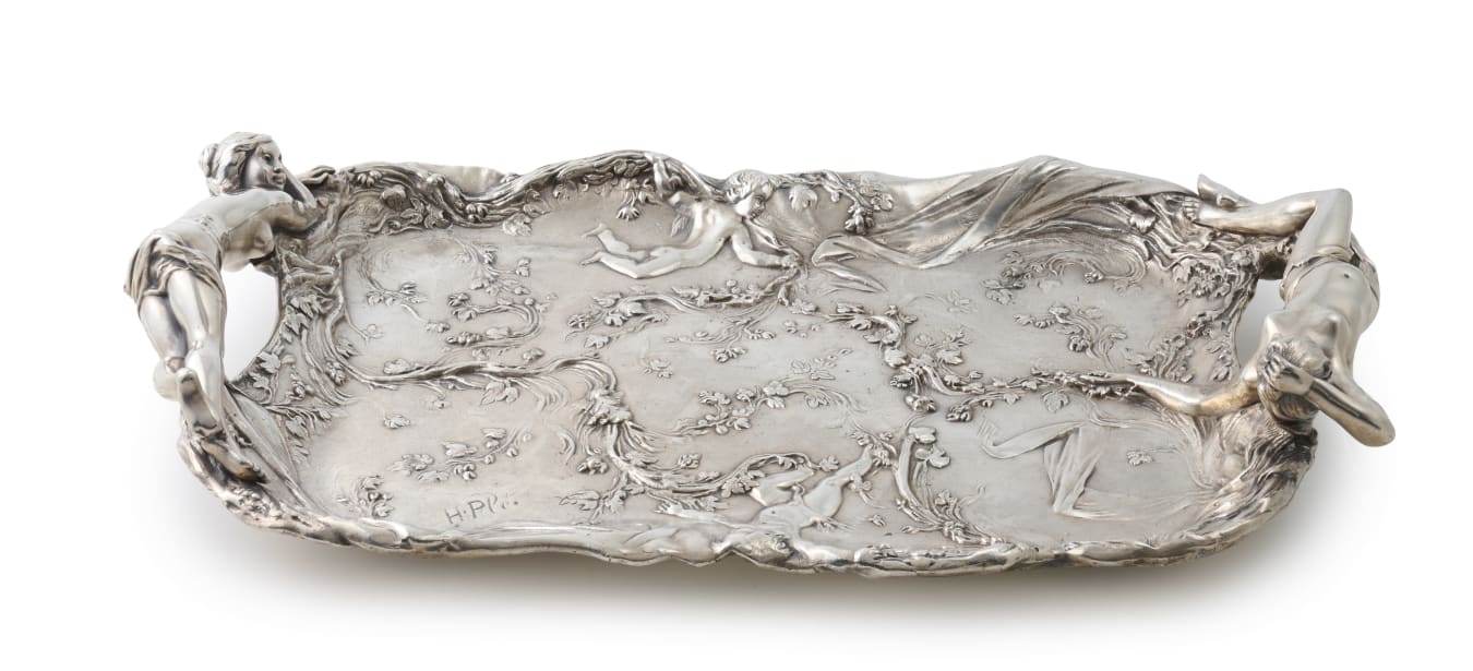of undulating rectangular outline, moulded in relief with blossom, scrolling foliage, drapery and figures, engraved with initials 'H.PL' the sides applied with maiden handles