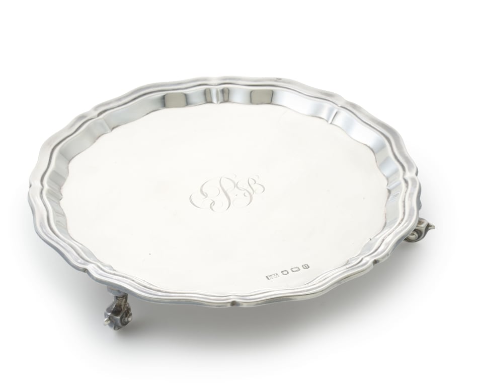 with wavy rim, circular, engraved with initials, raised on three leaf-capped feet, 330g